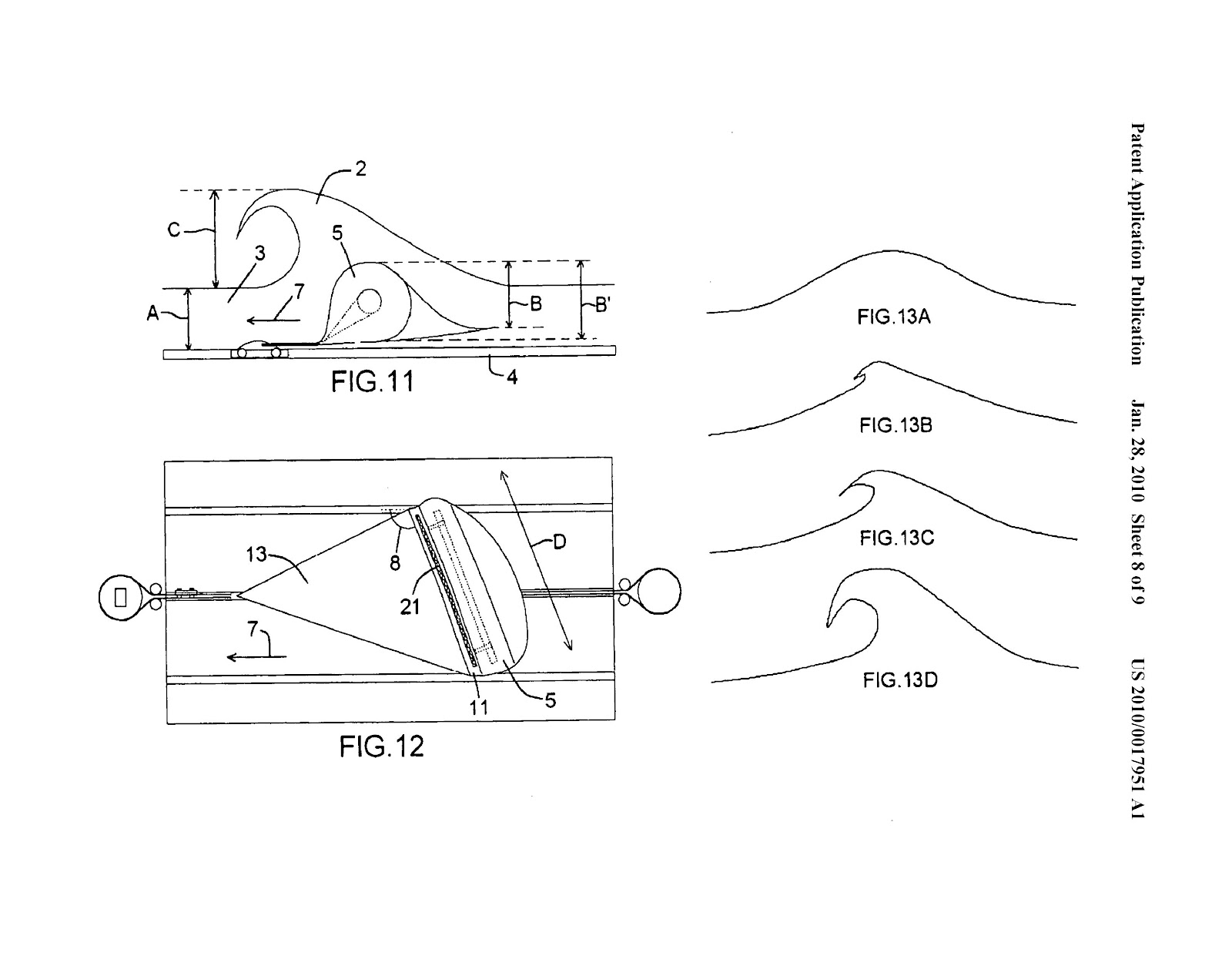 Como puede verse en la Figura 12, la lengüeta (11) puede disponer de una franja permeable (21), por ejemplo tipo red, capaz de ser abierta o cerrada para variar su superficie. En caso de estar abierta, cuando el perfil (5) se desplaza dicha franja permeable (21) deja entrar parte de agua por debajo del perfil (5), empujándose menos agua hacia arriba. La mayor apertura o cierre de la franja permeable (21) permite modificar la forma de la ola (2) y hacerla de pendiente más suave o más fuerte, según las necesidades del surfista. De este modo, el hecho de variar el grado de apertura de la franja permeable (21) puede producir unos efectos parecidos a variar el cociente B/A explicado anteriormente (pudiendo ser una alternativa más sencilla de ejecutar).