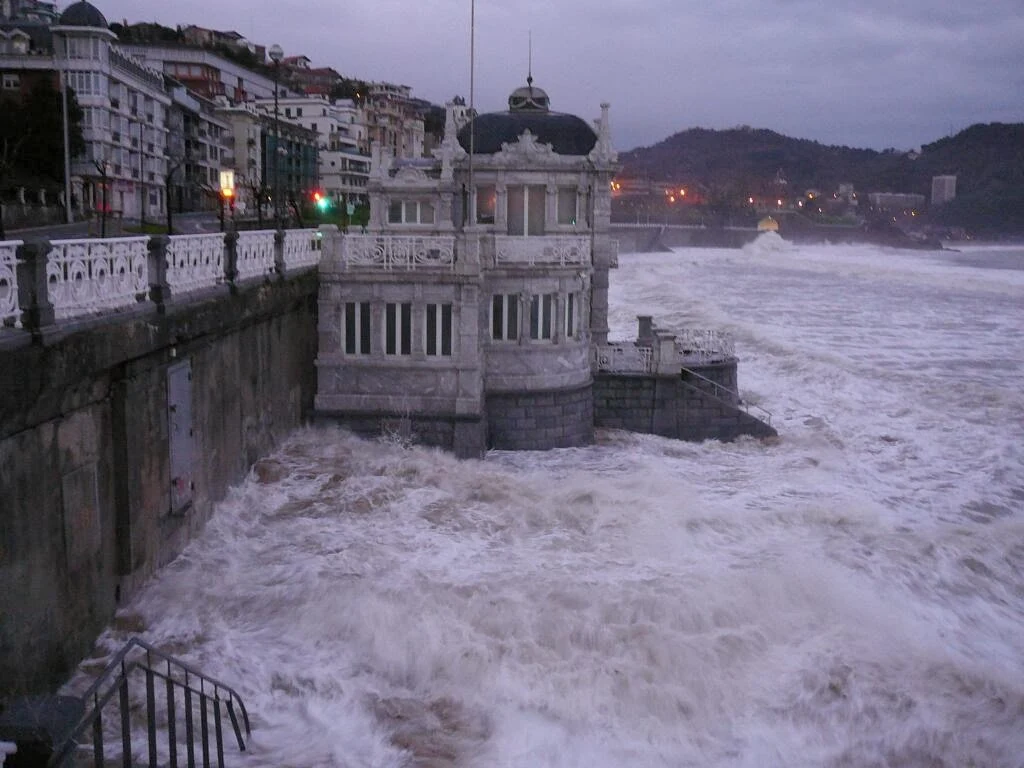 En Donosti las olas han subido por el Urumea para causar destrozos en los primeros puentes que lo cruzan, además de anegar varios bajos en la parte vieja.
